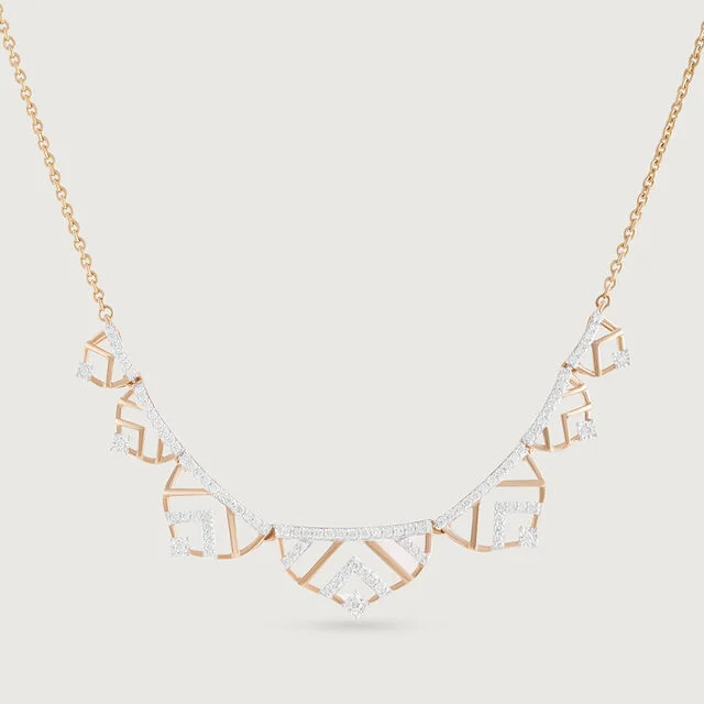 Unveil the magic of art with this 14 Kt yellow gold necklace. Featuring diamonds set in prongs and inspired by the fluid curves and zig-zag forms of Lippan art, this piece blends traditional craftsmanship with contemporary sparkle.